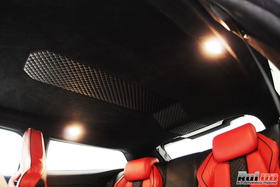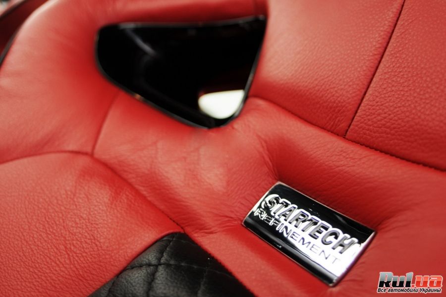 Салон авто также подвергся превращению - тюнинг-ателье Startech глобально подошла к спорт-образу авто. Поэтому у автомобиля спортивный руль, алюминиевые педали, подставка для ног и кожей обшитый рычаг коробки передач, кожаные сидения, двери панели - причем обивка яркого красного цвета. Не обошлось и без Алькантары, элементов из дерева и карбона.В Дубаи показывали бело-черный вариант. Европейцам показали черно-красный, не мнее эффектный.