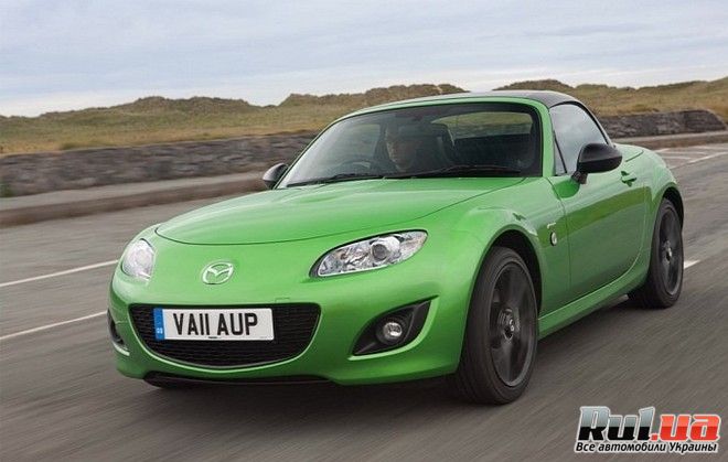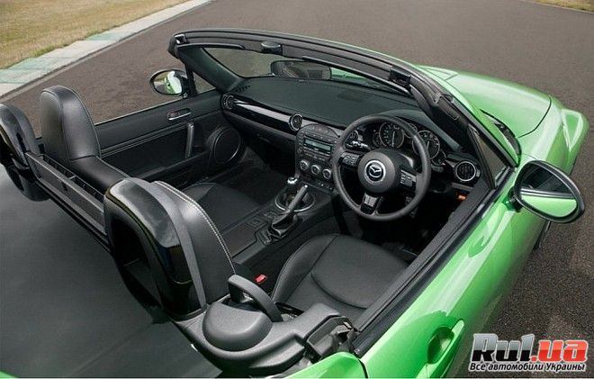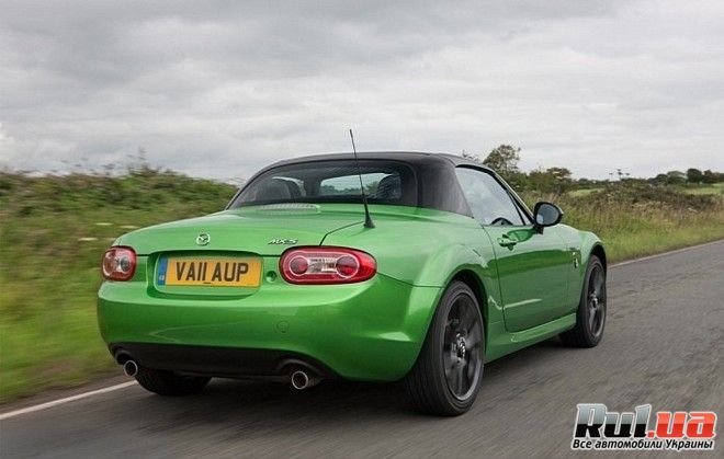 Mazda MX-5 Sport Black получила складывающуюся черную жесткую крышу, которая эффектно смотрится на зелено-перламутровом кузове родстера, либо возможны варианты цвета кузова - белого и красного цвета. Спорткар снабдили 17-ти дюймовыми легкосплавными дисками. Крыша способна сложиться за 12 секунд.