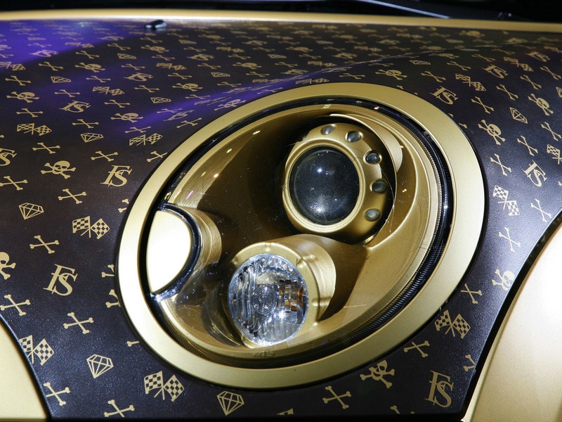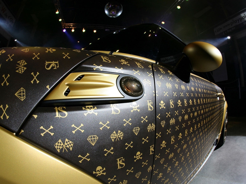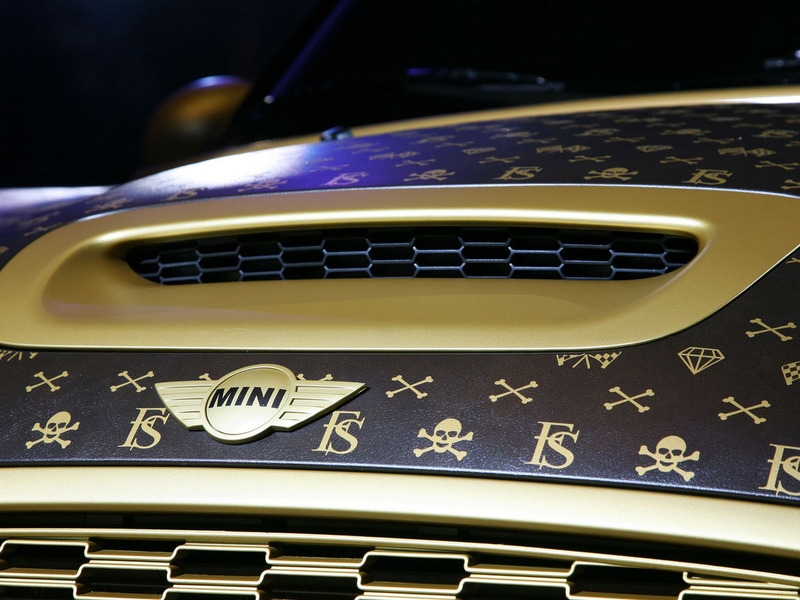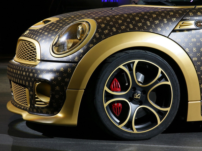 Несмотря на очевидное сходство текстуры кузова тюнинг-мобиля с сумками известной модной фирмы, при ближайшем рассмотрении ничего общего между ними нет. Mini JCW, конечно, обтянули пленкой с текстурой, напоминающей кожу, однако нанесенные на нее вручную узоры используются в фэшн-индустрии крайне редко. Золотистую сетку образуют небольшие изображения скрещенных костей, спортивных флагов, черепов...